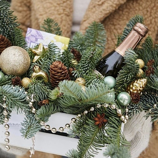 Découvrez nos arrangements de Noël créés avec soin: Présenté dans une élégante caisse blanche, il inclut une bouteille (au choix selon votre boutique) et de petites douceurs soigneusement intégrées pour créer un cadeau raffiné chaleureux et festif.