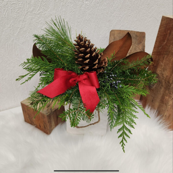 Découvrez nos arrangements de Noël créés avec soin: un mélange chaleureux de verdure fraîche, de détails champêtre et d’élégance festive, prêts à illuminer votre maison pour le temps des Fêtes.